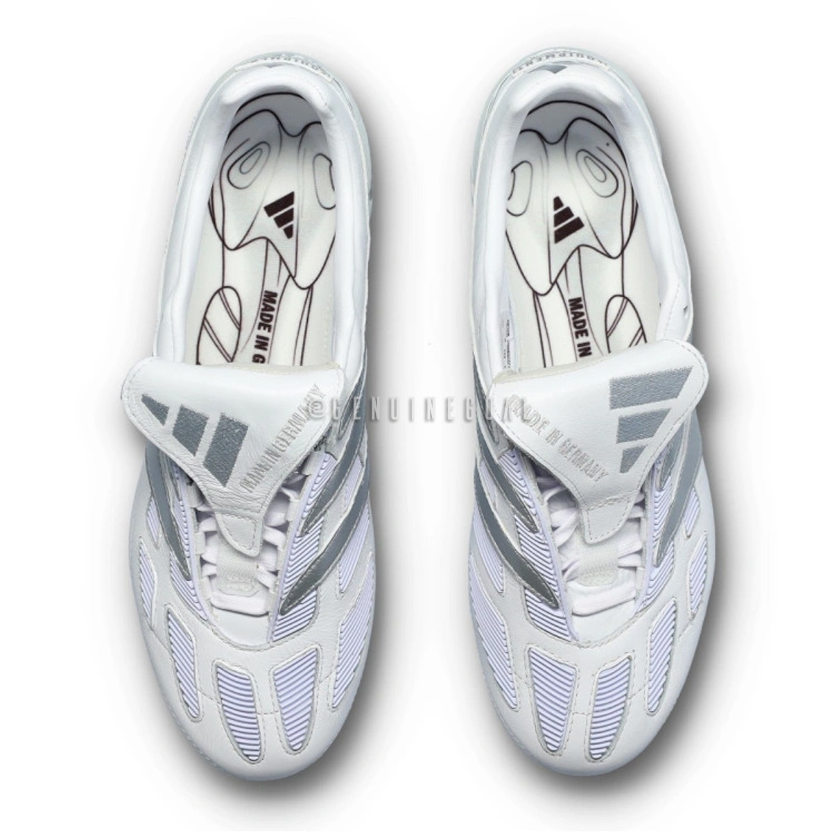 Revive una leyenda con las adidas Predator Precision Elite Made in Germany FG, una edición de élite fabricada artesanalmente en la icónica fábrica de adidas en Scheinfeld, Alemania. Esta obra maestra futbolística rinde homenaje a la silueta original, ahora con un elegante diseño blanco con detalles metálicos que la hacen destacar tanto en el campo como fuera de él.